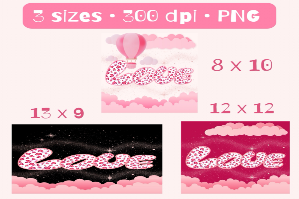10 custom love design graphic images, in 3 sizes; 12 x 12, 8 x 10, 13 x 9.
